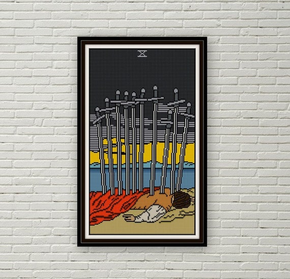 The imagery is always so dark and macabre. Ten of swords is a minor arcana tarot card. Tarot cards are used throughout much of europe to play tarot card games. They deal with problems and troubles, planning, communication, ideas, your intellect and how you use it.